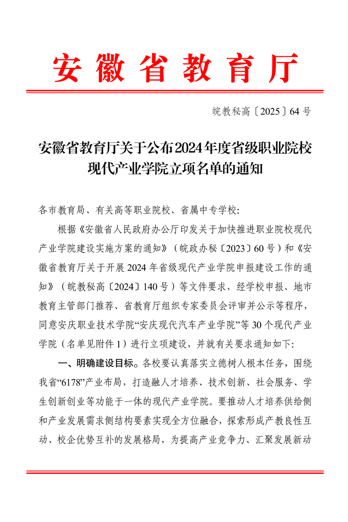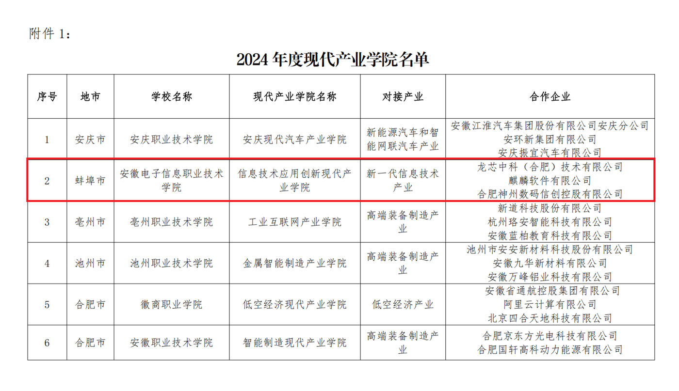 本网讯 近日,安徽省教育厅公布2024年度省级职业院校现代产业学院立项名单,学院联合龙芯中科(合肥)技术有限公司、麒麟软件有限公司、合肥神州数码信创股份有限公司等单位共建的信息技术应用创新现代产业学院成功入选,获批立项建设。这是学院深入贯彻落实国家产教融合发展战略,进一步深化产教融合、校企合作,推动区域战略性新兴产业发展获批的第二个省级现代产业学院。