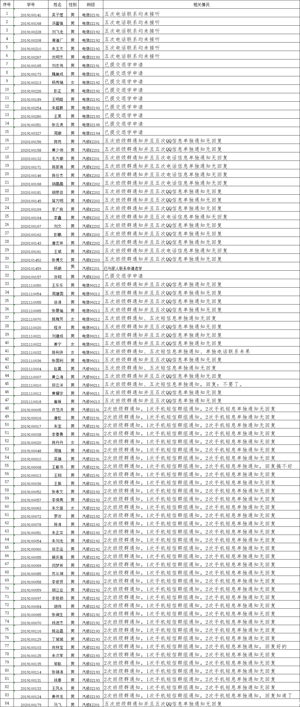 学院高职扩招生已按教学进程完成了开课,为进一步规范和完善高职扩招生的学籍管理工作,确保高职扩招生学籍处理符合相关规定,根据《taptap点点官方网学籍学历管理实施细则》规定,满足第九章第四十一条“(四)未经批准连续两周未参加学院规定的教学活动的;(七)本人申请退学的”等情形的,可予退学处理;在前期工作的基础上,结合学生本人意愿,拟将部分学生按退学处理,并予以公示,具体名单如下: