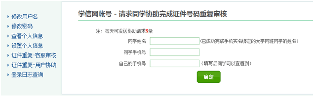 在解决办法页面,点击【发送协助请求】按钮,输入同学姓名等信息,然后请该同学登录自己账户,点击页面右上角的收件箱图标,协助解决证件号码重复。