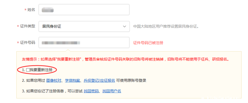 说明该证件号码之前在网站有注册记录。可使用找回用户名功能核实是否注册过账号。如果您未曾使用此身份证号码注册账号或已无法成功重置密码,可以考虑勾选页面“我要重新注册”,正确填写信息后点击【完成注册】;系统会提示您当前注册的账号需要核验身份证信息,使用当前注册的账号登录系统、并选择下途径中的任意一种来完成身份核验事宜。