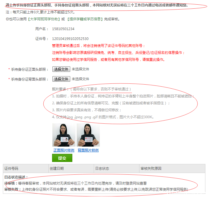 上传完毕后等待客服审核,审核通过后您才可以进入实名信息绑定步骤。客服审核由学信网进行人工处理,为了能及时准确的解决您注册过程中遇到的问题,请按要求上传有效的身份证照片。你也可以点击左侧的菜单“证件重复-客服审核”来关注客服的审核进度。